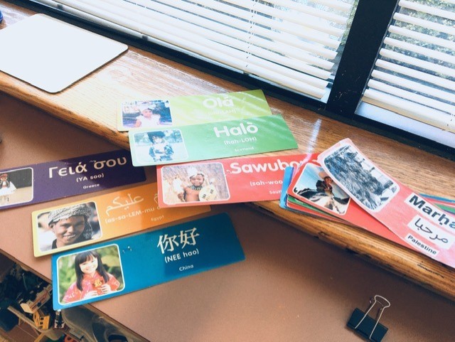 We usually start the day with circle time. Each week our class picks a different language card and we learn how to say hello in another language. We take turns going around the circle greeting one another. For the greeting, the children say their friend’s name, like, “nǐ hǎo, Veronika”, then you’d say, “nǐ hǎo, Kylie”. It’s only one word, but it usually sticks. We usually look for the country on the map and learn a few fun facts about where that language is spoken. It’s important for them to learn about other cultures and languages.