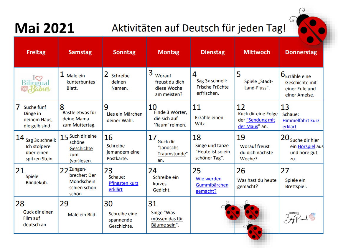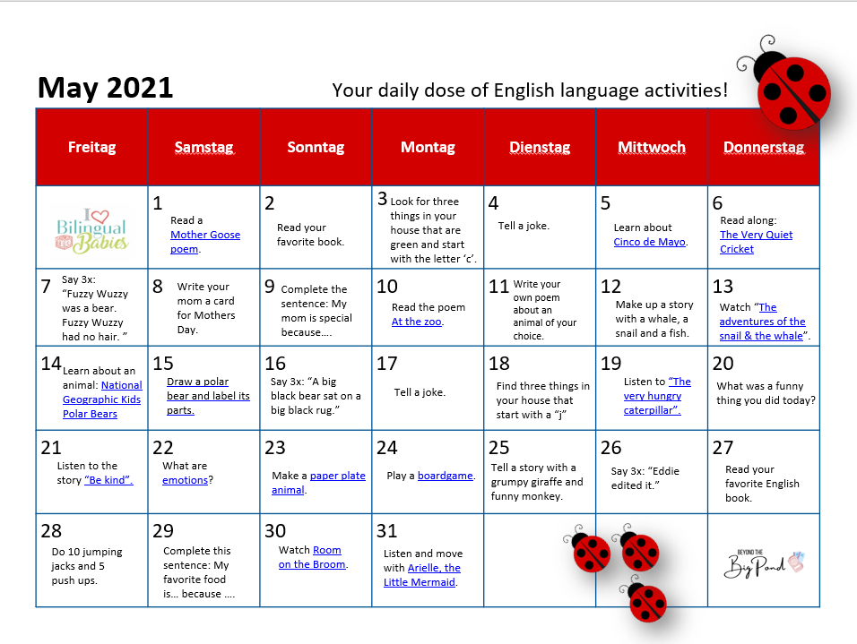 Download for free or access online and enjoy some fun language activities with your children. Read, sing, dance, cook and much more with your little ones in English or German.