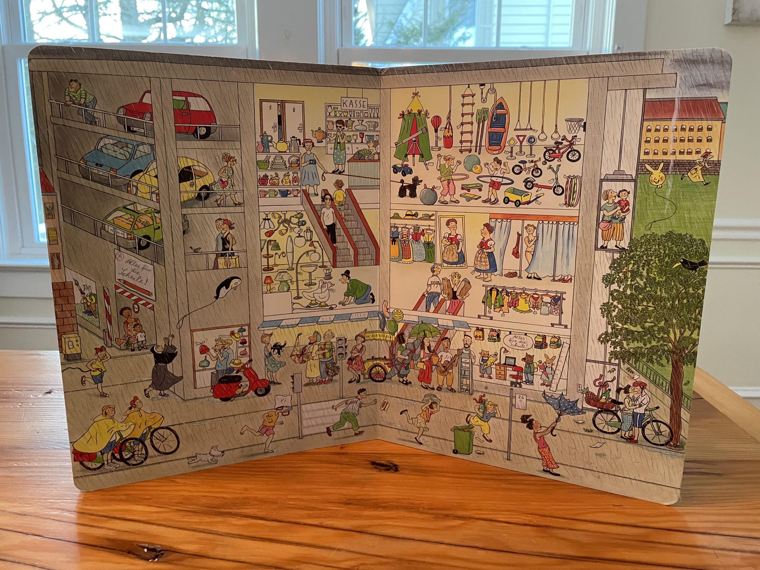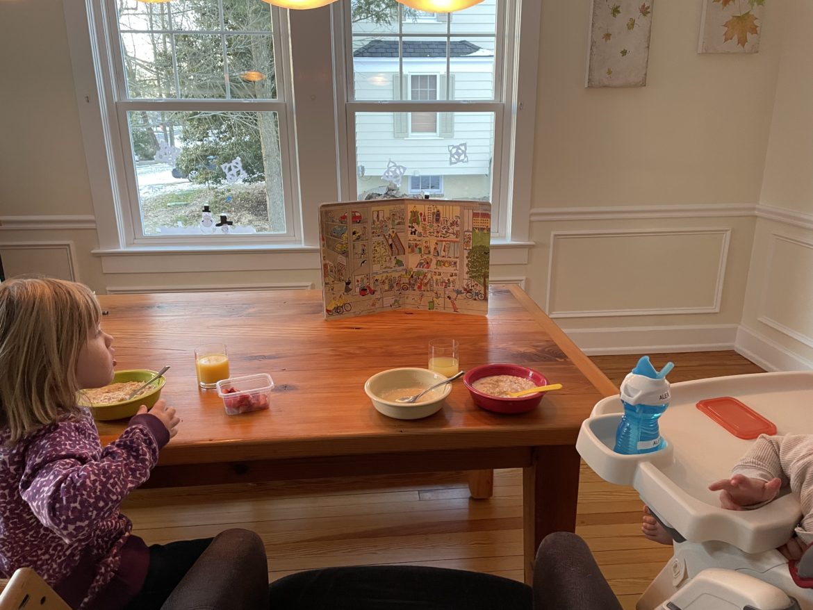Here is one activity that I have used with my children (5 years & 15 months) lately. We have been playing the I spy game over breakfast (German: Ich sehe was, was du nicht siehst…). We have been using so called “Wimmelbücher” (hidden picture books), that is, books that do not feature any text, but large pages with busy pictures. We simply place the book on the table and take turns guessing what the other player spotted. While we mainly use colors as identifiers (e.g., I spy with my little eye something that is green.), I have switched it up at times to focus on other concepts. For example, my daughter had shapes as a topic in Math class. So we played it with a focus on shapes (e.g., I spy with my little eye something that is round.).